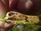 Larva: look for small holes in the stem of the foodplant in September, sometimes extruded frass being visible which may indicate the presence of a larva. Distinctively red-striped larva needs to be seen to exclude the possibility of a weevil species, the larva of which feeds in the stem of this plant.