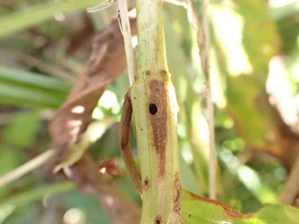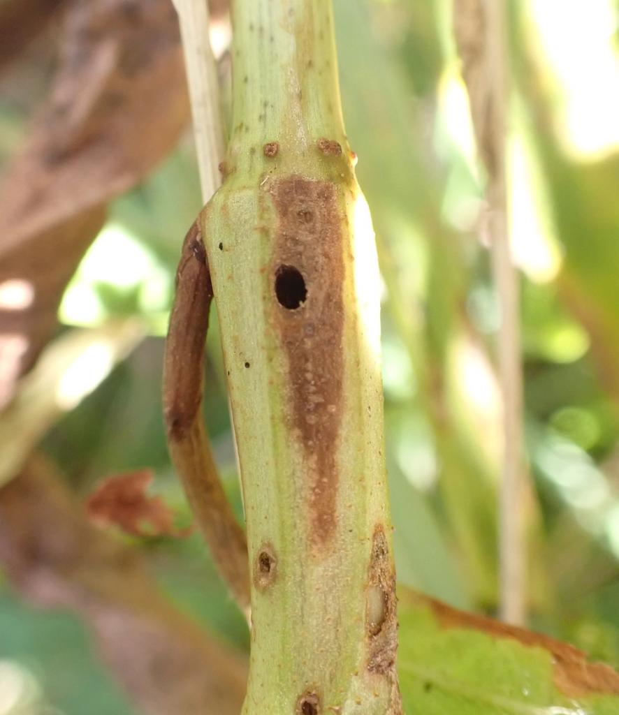 Larva: look for small holes in the stem of the foodplant in September, sometimes extruded frass being visible which may indicate the presence of a larva. Distinctively red-striped larva needs to be seen to exclude the possibility of a weevil species, the larva of which feeds in the stem of this plant.